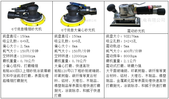 4、中国台湾Hongrui高品质工业级低耗气低音型气动打磨机。打磨时耗气少、噪音低,符合国内和欧盟打磨噪音要求。6寸低耗气噪音8mm大偏心粗磨机,打磨偏心大、打磨快速高效;6寸低耗气低噪音2.5mm小偏心精细砂纸打磨机,打磨偏心小、打磨精度高;93x176mm方磨机震动式打磨,平衡度高、研磨力强,双手压下磨机不会停,大平面快速打磨抛光