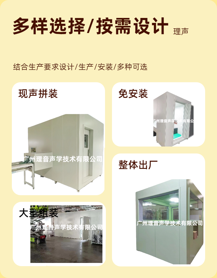 广州理音声学技术有限公司专业从事隔音室设计/生产。公司从事隔音室/静音室/隔音房/静音房/流水线隔音室生产二十年。免安装隔音室是公司结合现代工业生产需求专门设计升级的一种隔音降噪产品。公司生产的免安装隔音室,整体结构扎实,耐用,可随着生产需要移动,为客户提高生产效率,节约生产成本。公司免安装隔音室可量身定制,可批量化生产,可参考成功案例众多。欢迎有需求客户来电咨询:13002090809谭生。